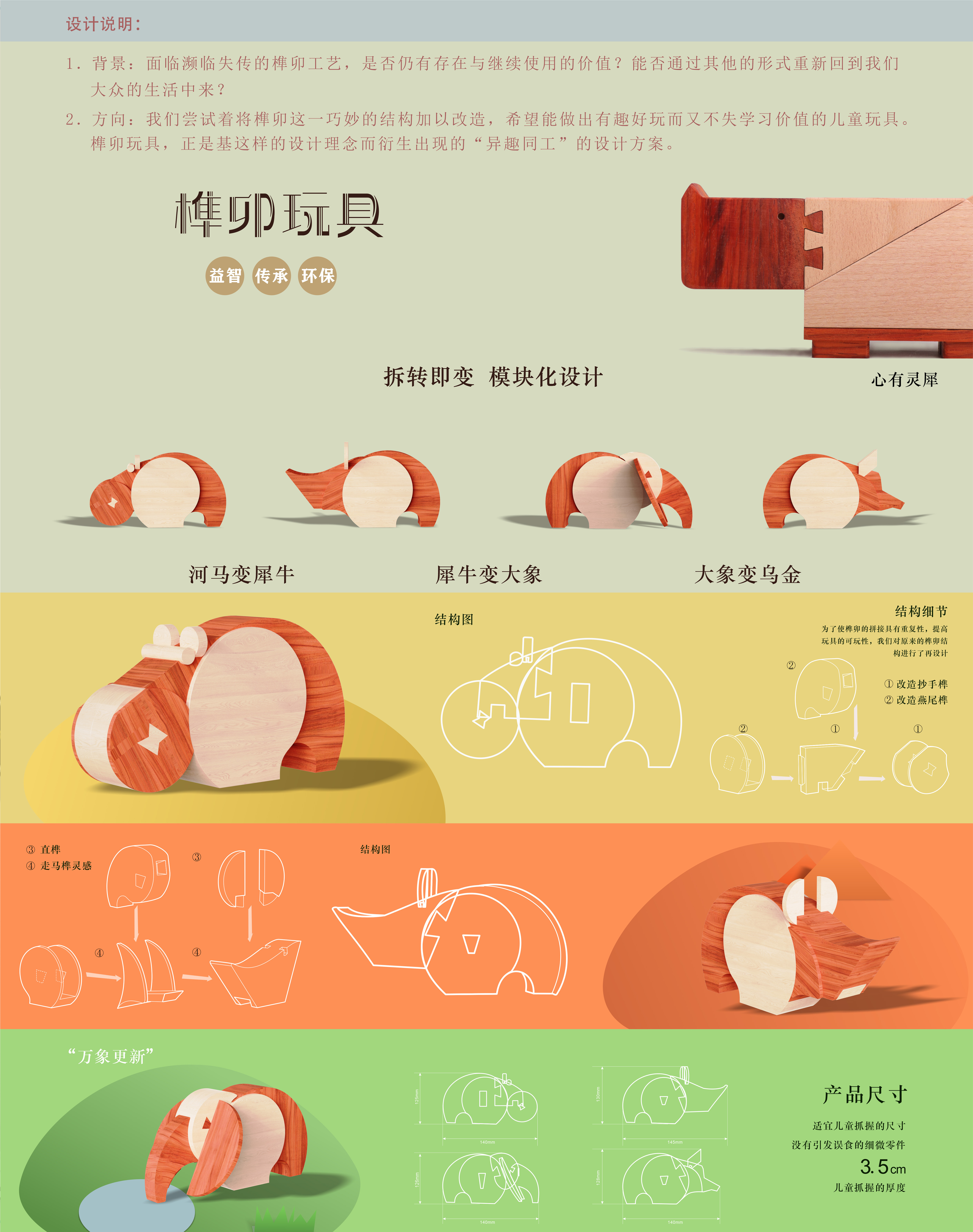 1.背景:面临濒临失传的榫卯工艺,是否仍有存在与继续使用的价值?能否通过其他的形式重新回到我们大众的生活中来? 2.方向:我们尝试着将榫卯这一巧妙的结构加以改造,希望能做出有趣好玩而又不失学习价值的儿童玩其。桦卯玩具,正是基这样的设计理念而衍生出现的"异趣同工"的设计方案。