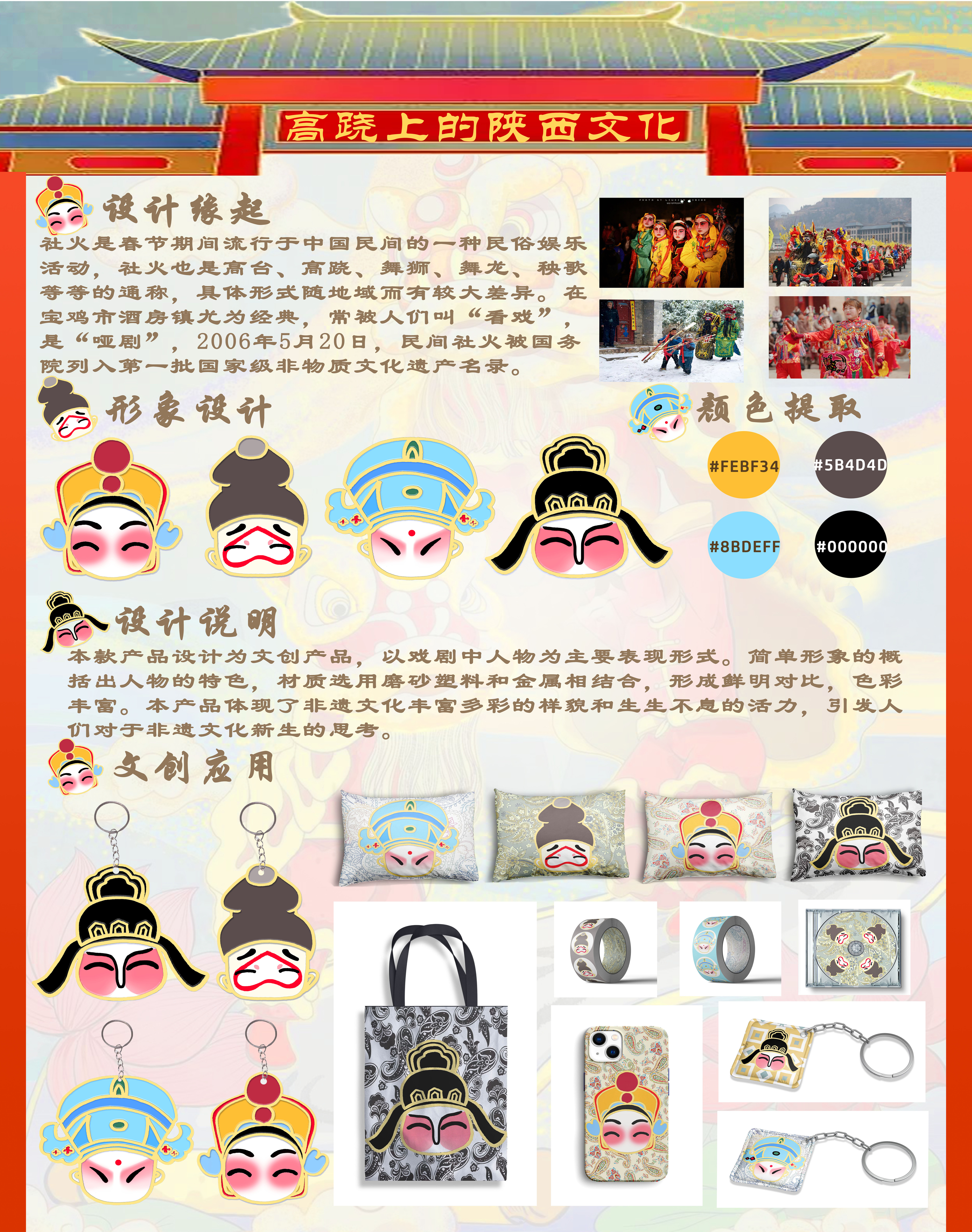 社火是春节期间流行于中国民间的一种民俗娱乐活动,本款产品设计为文创产品,以社火为题,戏剧中人物为主要表现形式。简单形象的概括出人物的特色,材质选用磨砂塑料和金属相结合,形成鲜明对比,色彩丰富。本产品体现了非遗文化丰富多彩的样貌和生生不息的活力,引发人们对于非遗文化新生的思考。