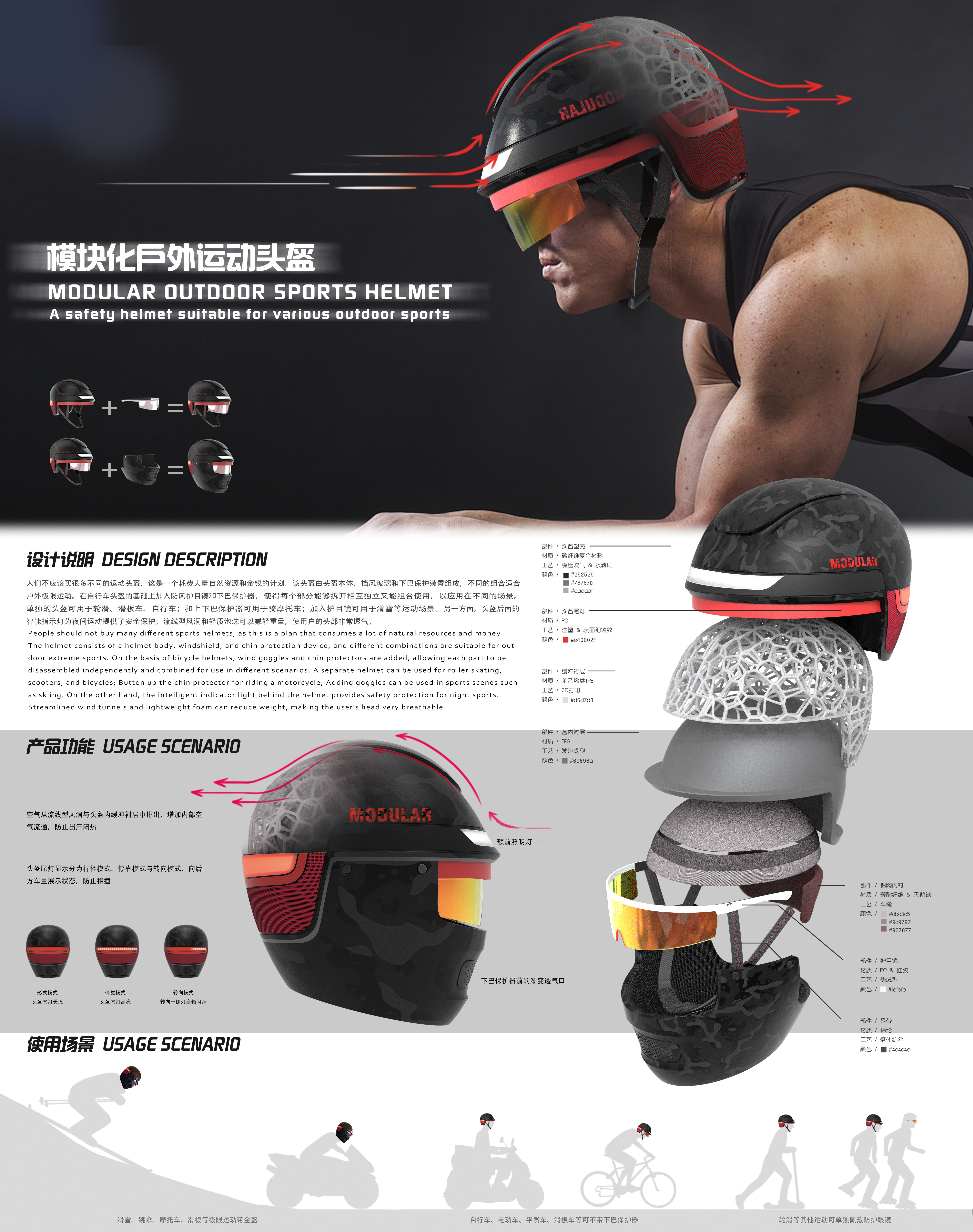 人们不应该买很多不同的运动头盔,这是一个耗费资源和金钱的计划。该头盔由本体、挡风玻璃和下巴保护装置组成,不同的组合适合户外极限运动。在自行车头盔的基础上加入防风护目镜和下巴保护器,使得每个部分能够拆开相互独立又能组合使用,以应用在不同的场景。单独的头盔可用于轮滑、滑板车、自行车;扣上下巴保护器可用于骑摩托车;加入护目镜可用于滑雪等运动场景。另一方面,头盔后面的智能指示灯为夜间运动提供了安全保护。