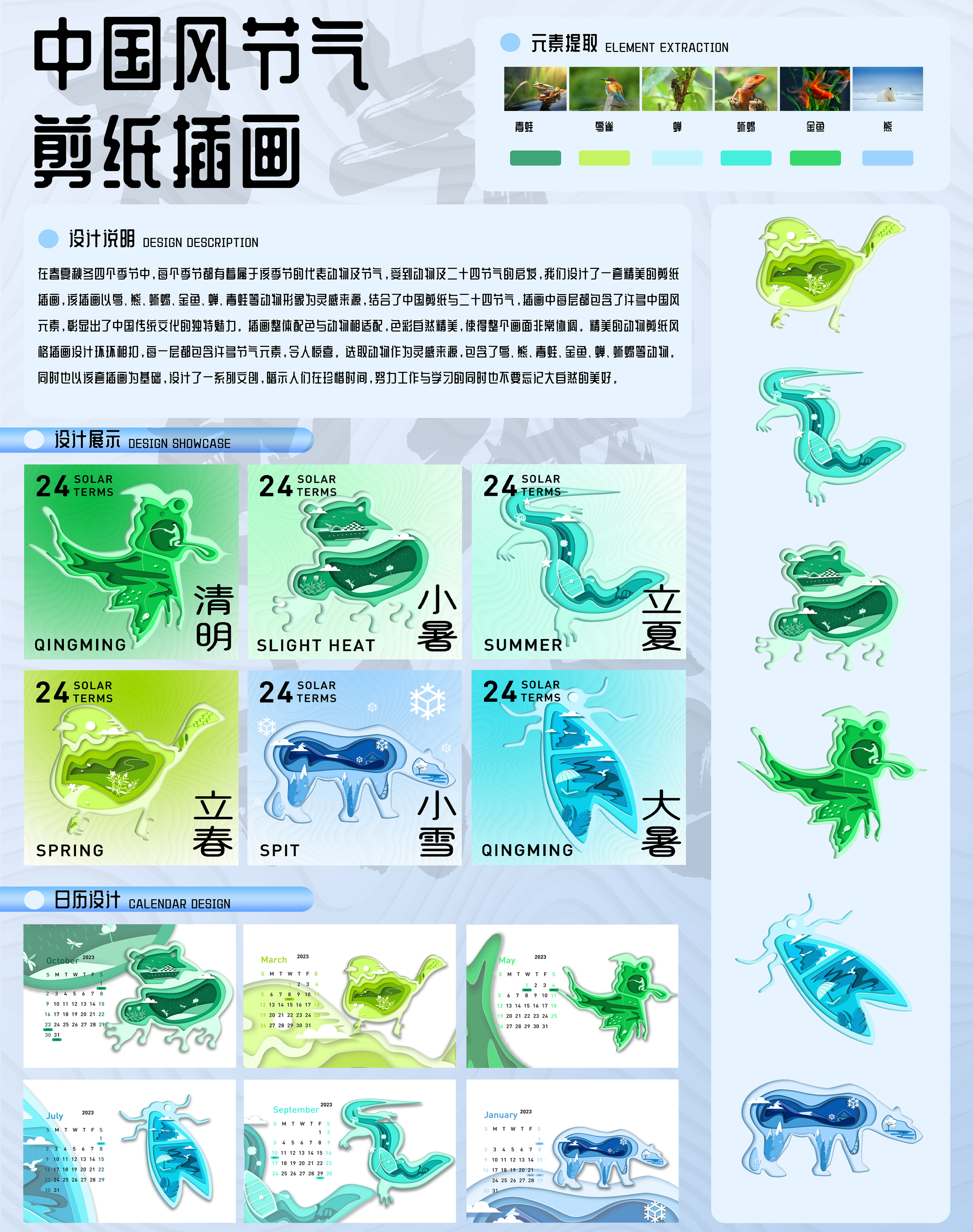 在春夏秋冬四个季节中,每个季节都有着属于该季节的代表动物及节气,受到动物及二十四节气的启发,我们设计了一套精美的剪纸插画,该插画以鸟、熊、蜥蜴、金鱼、蝉、青蛙等动物形象为灵感来源,结合了中国剪纸与二十四节气,插画中每层都包含了许多中国风元素,彰显出了中国传统文化的独特魅力,同时以该套插画为基础设计了一系列文创,暗示人们在珍惜时间,努力工作与学习的同时也不要忘记大自然的美好。