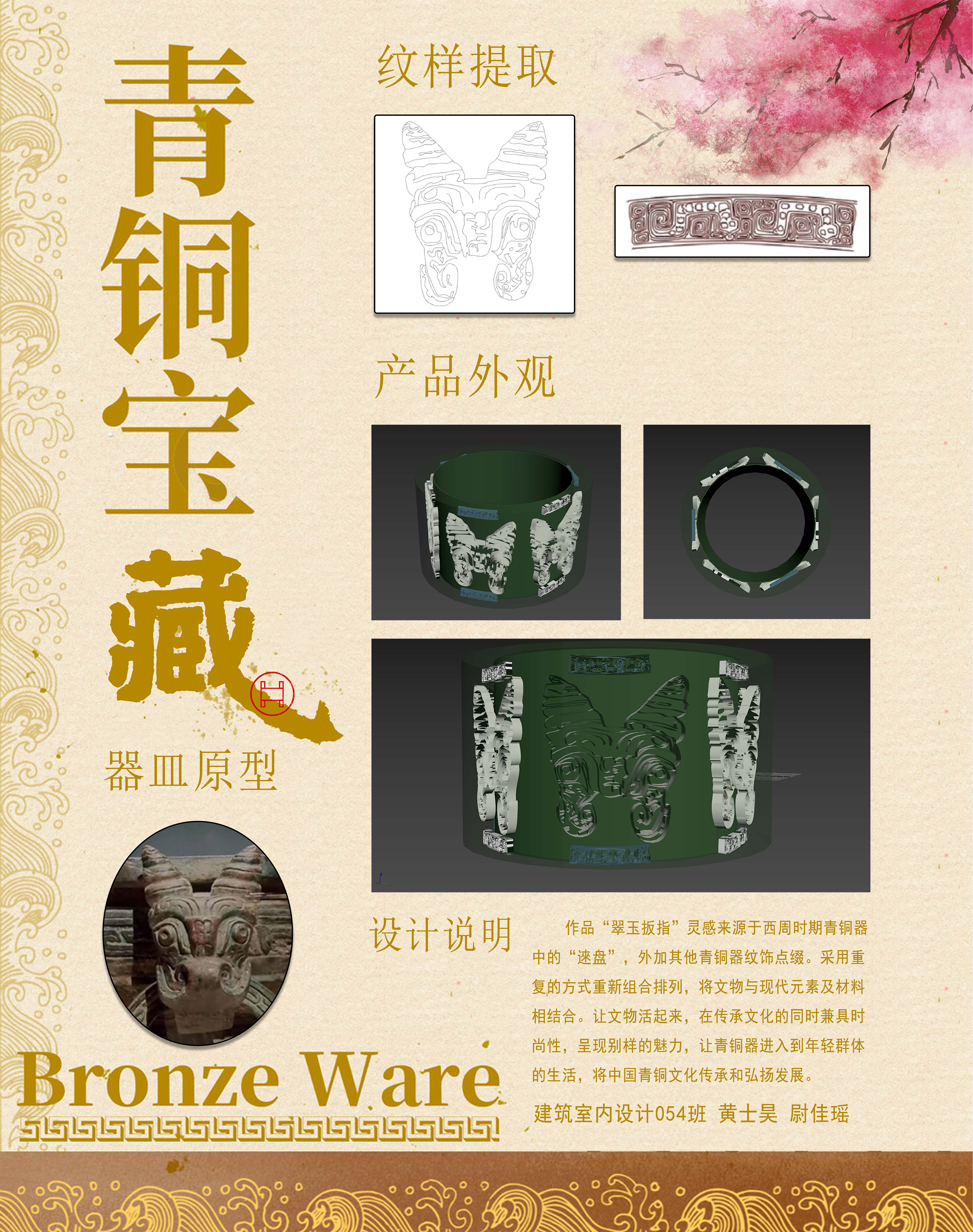 作品“翠玉扳指”灵感来源于西周时期青铜器中的“逨盘”,外加其他青铜器纹饰点缀。采用重复的方式重新组合排列,将文物与现代元素及材料相结合。让文物活起来,在传承文化的同时兼具时尚性,呈现别样的魅力,让青铜器进入到年轻群体的生活,将中国青铜文化传承和弘扬发展。