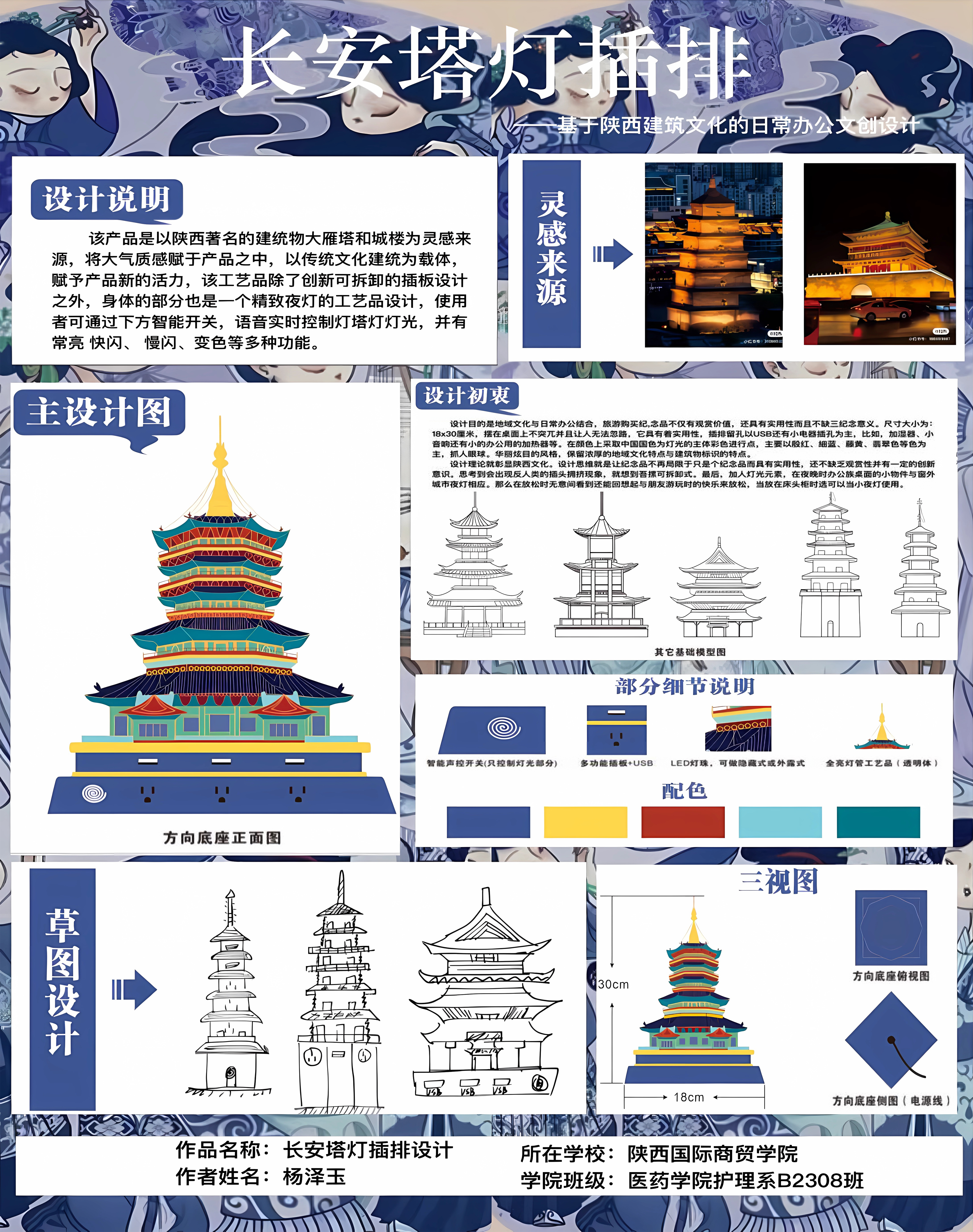 该产品是以陕西著名的建统物大雁塔和城楼为灵感来源,将大气质感赋于产品之中,以传统文化建统为载体,赋予产品新的活力,该工艺品除了创新可拆卸的插板设计之外,身体的部分也是一个精致夜灯的工艺品设计,使用者可通过下方智能开关,控制灯塔灯灯光,并有常亮 快闪、慢闪、变色等多种功能。