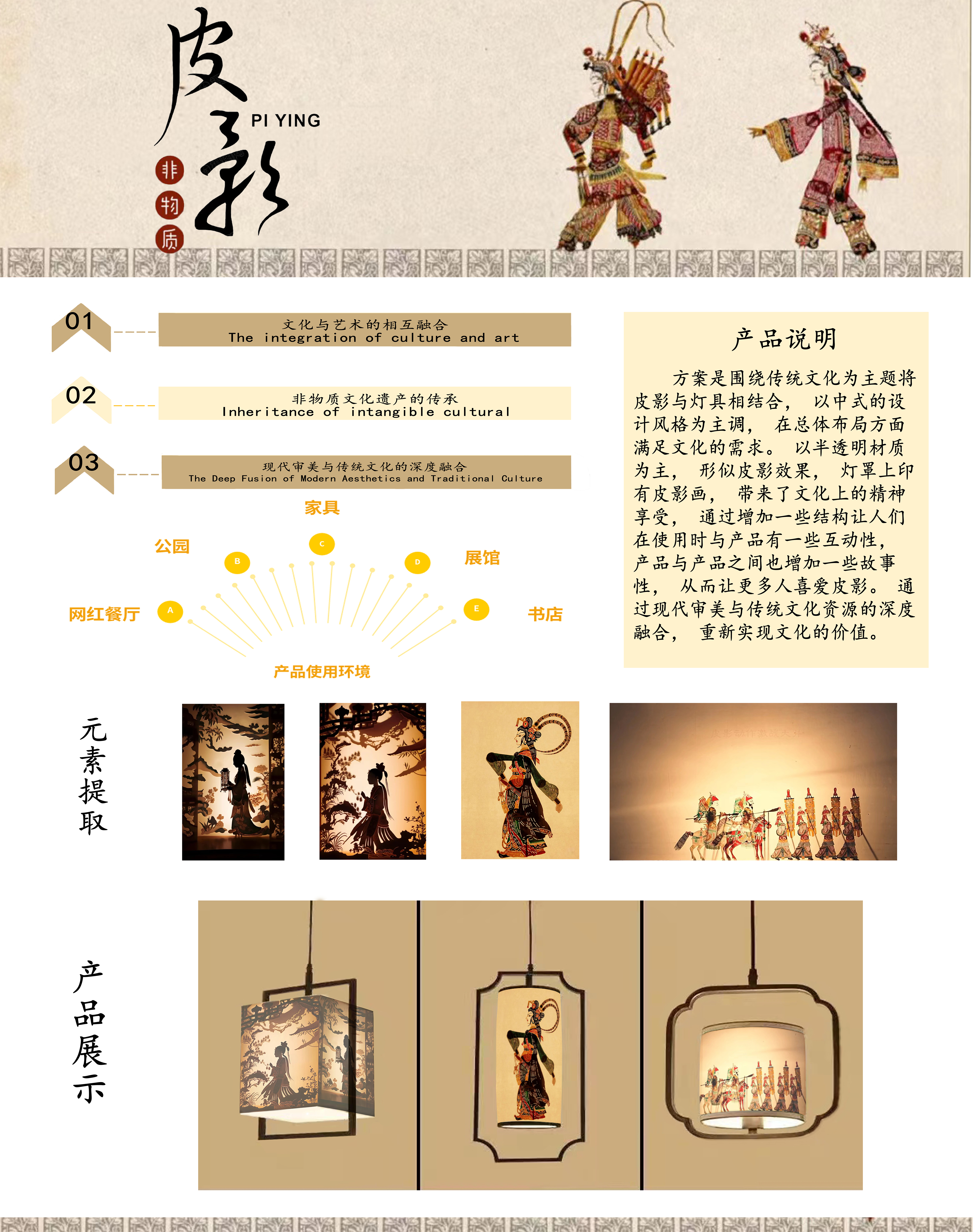 方案是围绕传统文化为主题将皮影与灯具相结合,以中式的设计风格为主调,在总体布局方面满足文化的需求。以半透明材质为主,形似皮影效果,灯罩上印有皮影画,带来了文化上的精神享受,通过增加一些结构让人们在使用时与产品有一些互动性,产品与产品之间也增加一些故事性,从而让更多人喜爱皮影。通过现代审美与传统文化资源的深度融合,重新实现文化的价值。