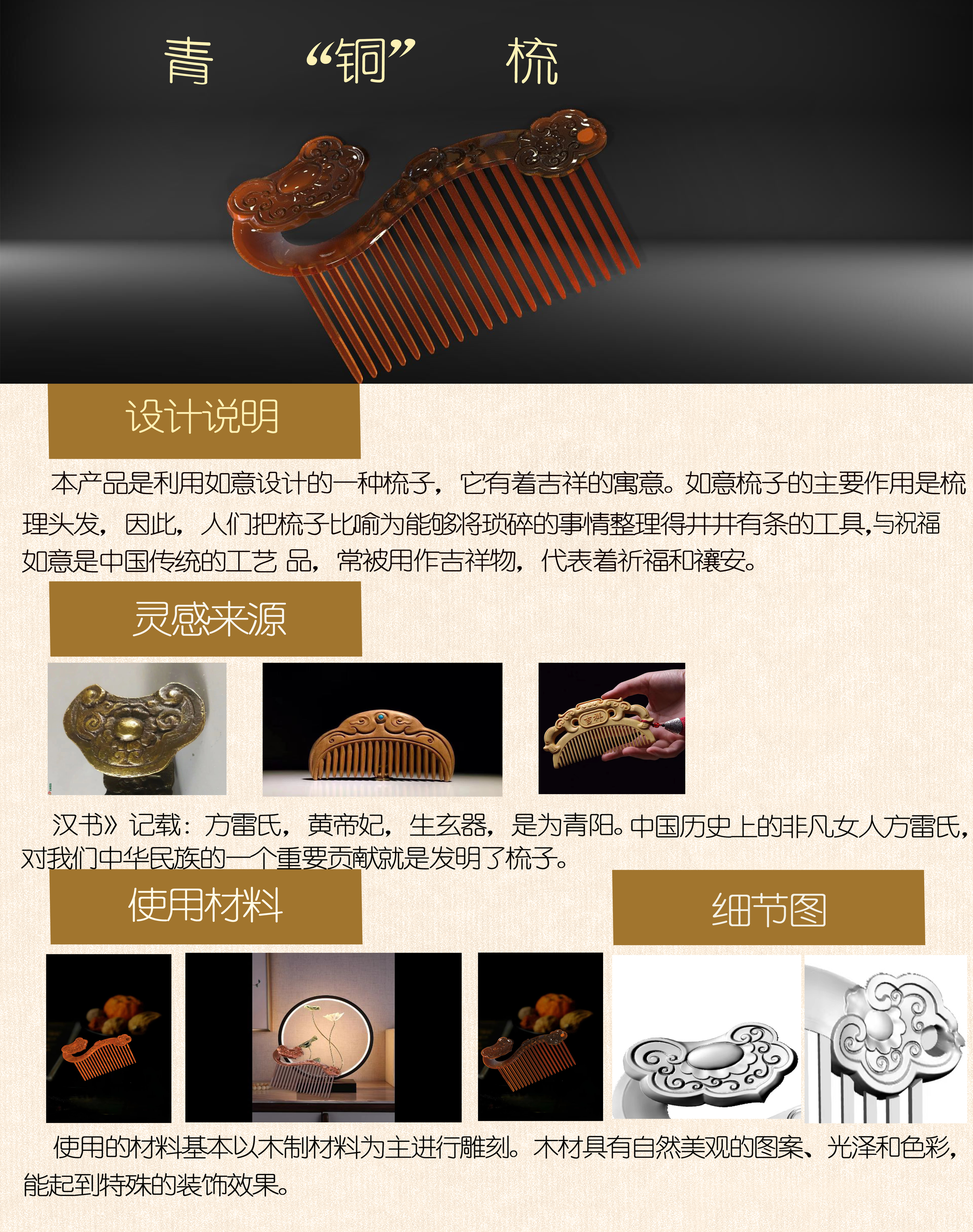 本产品是利用如意设计的一种梳子,它有着吉祥的寓意。如意梳子的主要作用是梳理头发,因此,人们把梳子比喻为能够将琐碎的事情整理得廾井有条的工具,与祝福。 如意是中国传统的工艺 品,常被用作吉祥物,代表着祈福和禳安。