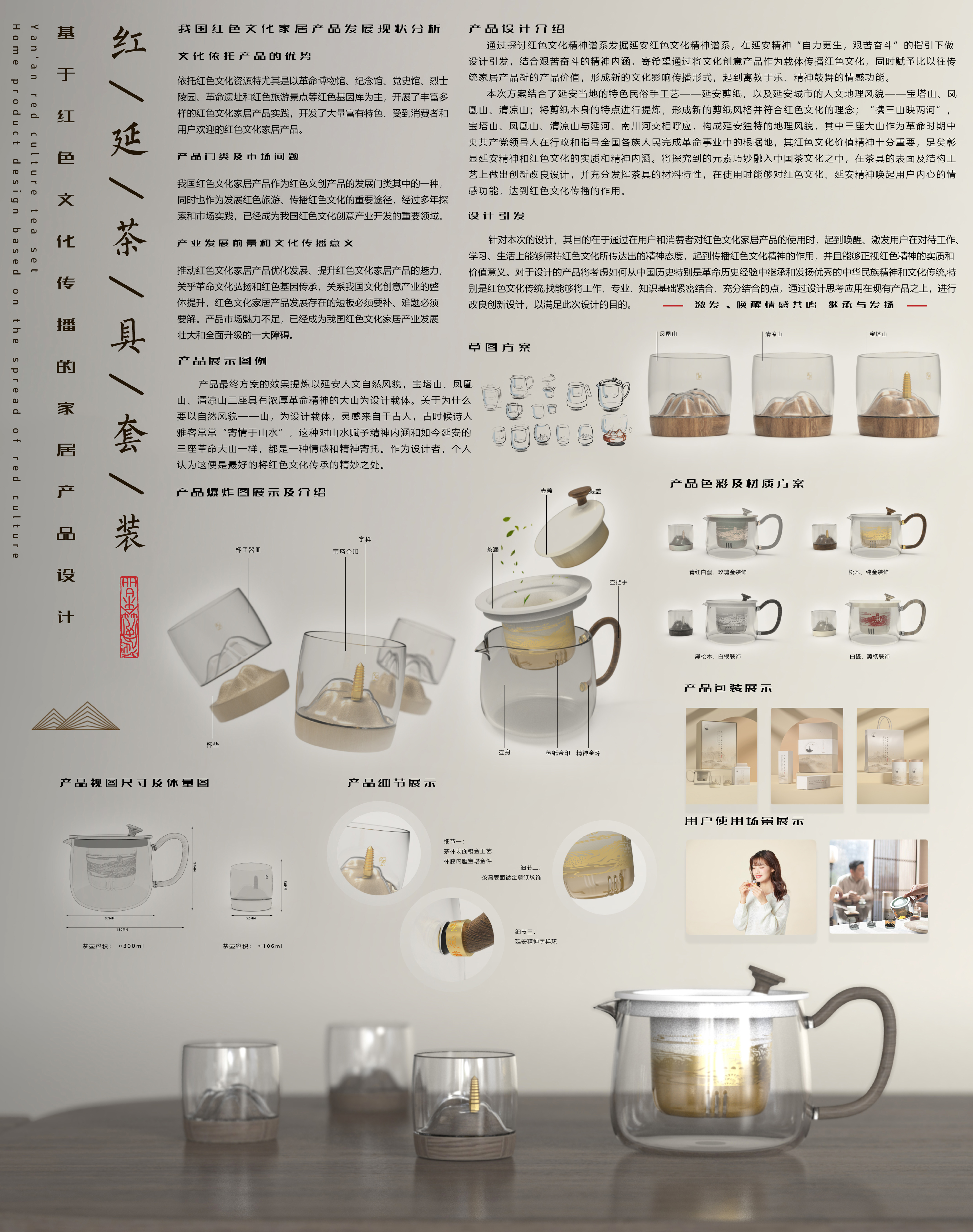 此设计结合了延安特色民俗手工艺剪纸,人文地理风貌宝塔山、凤凰山、清凉山;将剪纸特点提炼,形成新式剪纸风格并契合红色文化理念;“携三山映两河”,构成延安独特地貌,其红色文化价值精神十分重要,足矣彰显延安精神和红色文化的实质和精神内涵。设计融入茶具之中,在茶具表面及结构工艺上做出改良设计,并充分发挥茶具的材料特性,在使用时能够对红色文化、延安精神唤起用户内心的情感功能,达到红色文化传播的作用。