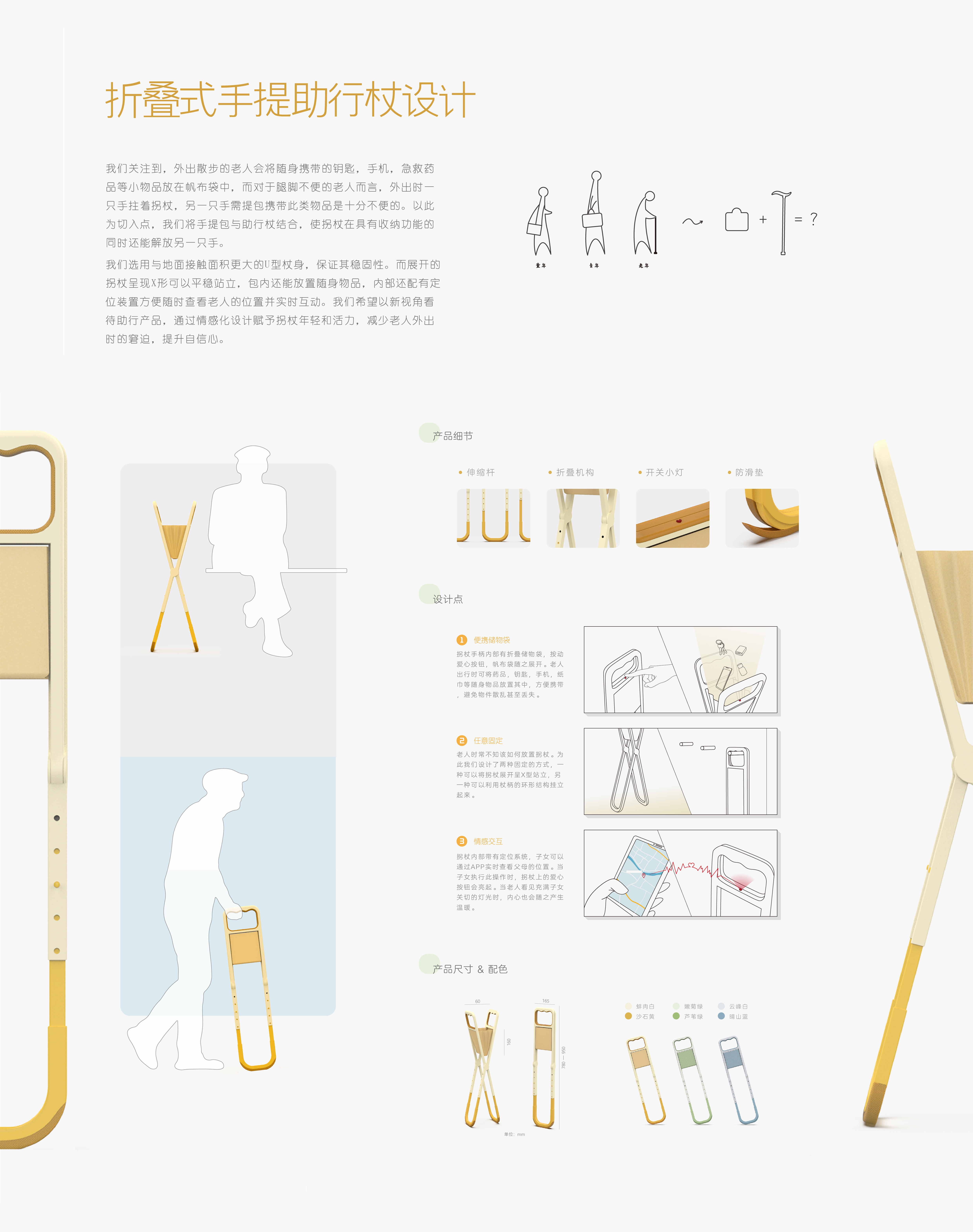 我们关注到,外出散步的老人会将随身携带的钥匙,手机,急救药品等小物品放在帆布袋中,而对于腿脚不便的老人而言,外出时一只手挂着拐杖,另一只手需提包携带此类物品是十分不便的。以此为切入点,我们将手提包与助行校结合,使拐杖在具有收纳功能的同时还能解放另一只手。通过情感化设计赋予拐杖年轻和活力,减少老人外出时的窘迫,提升自信心。
