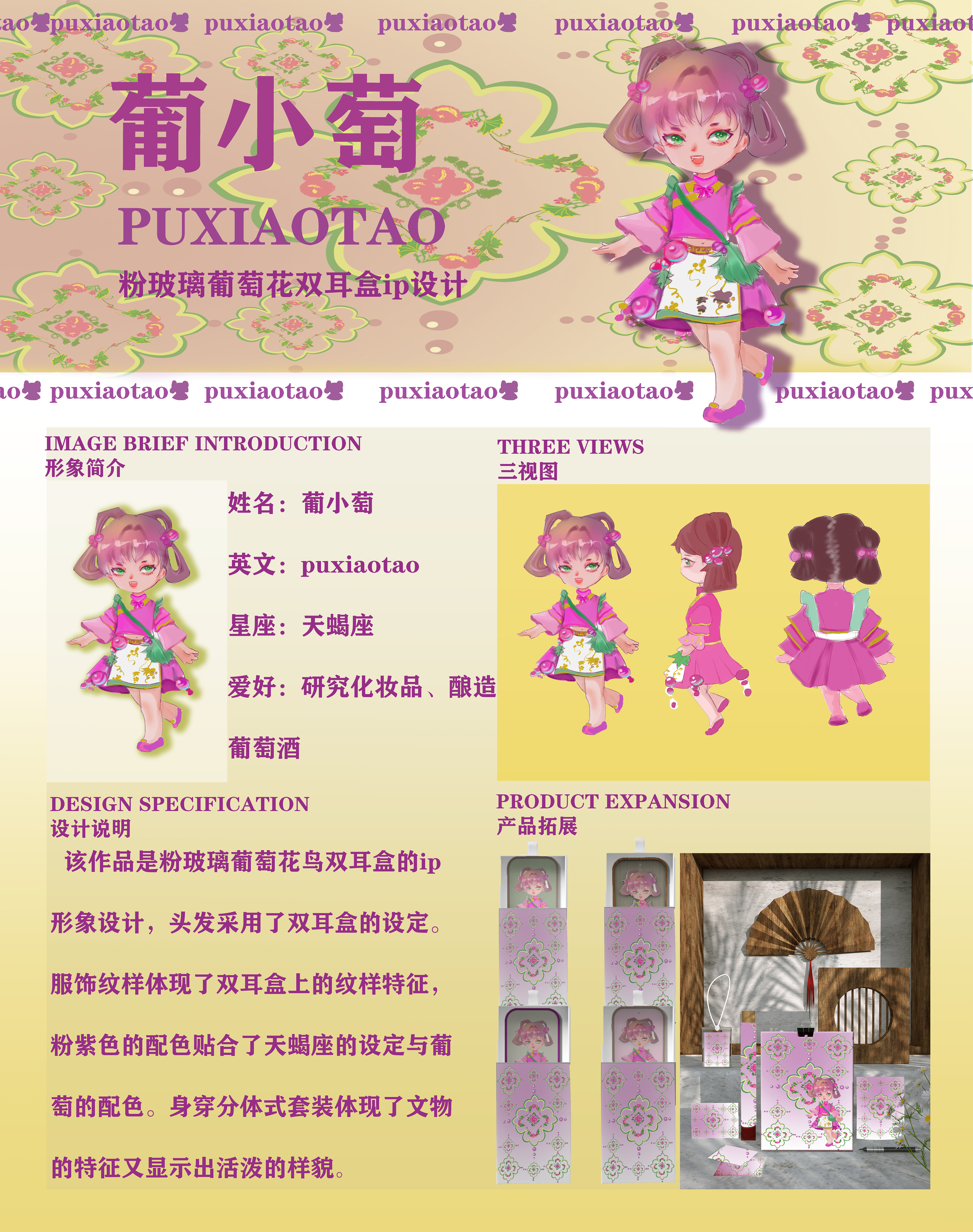 本设计基于故宫文物粉玻璃葡萄花鸟双耳盒进行的IP文创设计,本设计人物头发采用了双耳盒环的设定。服装纹样体现了双耳盒上的纹样特征,粉紫色的配色贴合了天蝎座的设定与葡萄的颜色。人物身穿分体式套装裙体现了文物的特征又显示出活泼的样貌。