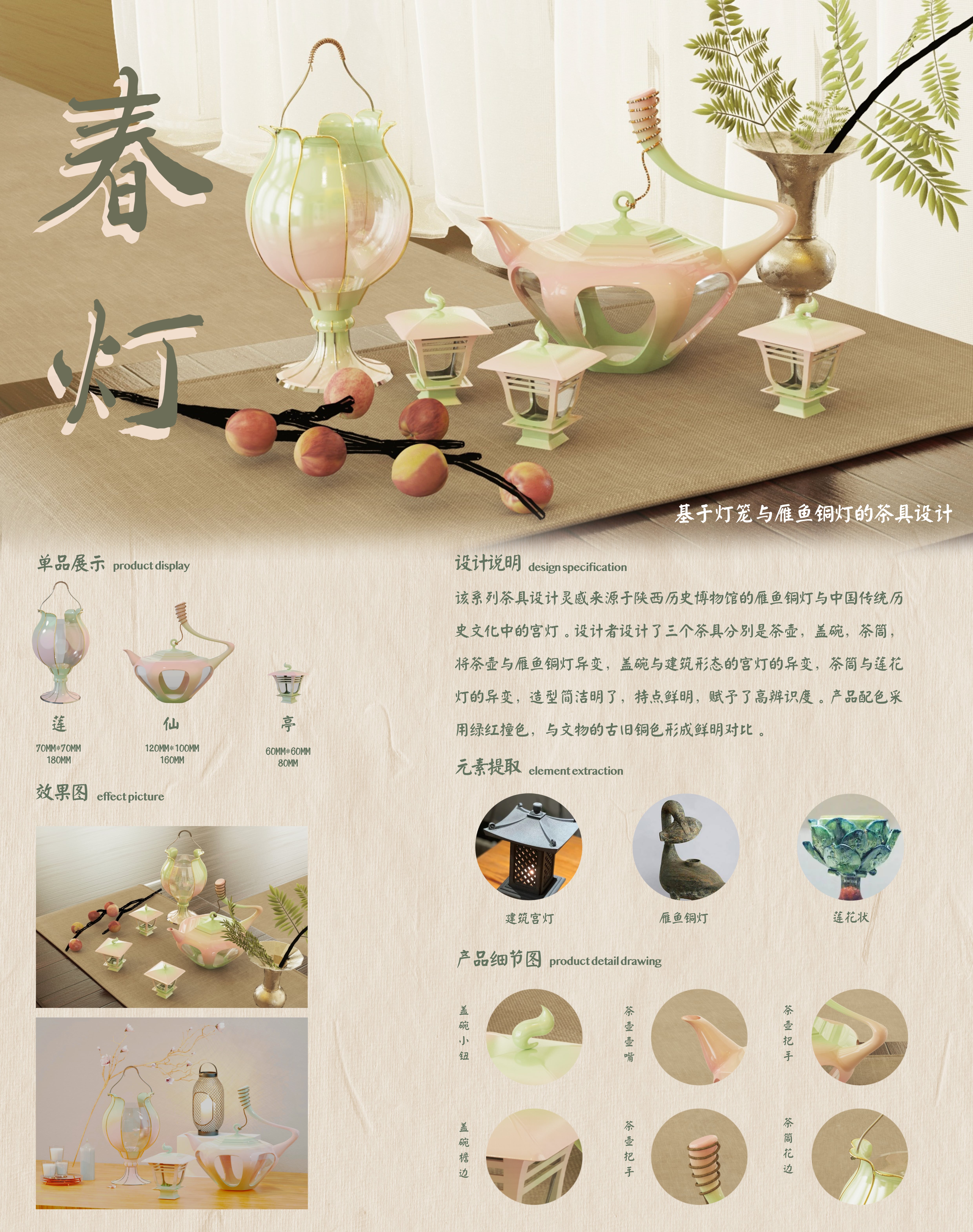 该系列茶具设计灵感来源于陕西历史博物馆的雁鱼铜灯与中国传统历史文化中的宫灯。设计者设计了三个茶具分别是茶壶,盖碗,茶筒,将茶壶与雁鱼铜灯异变,盖碗与建筑形态的宫灯的异变,茶筒与莲花灯的异变,造型简洁明了,特点鲜明,赋予了高辨识度。产品配色采用绿红撞色,与文物的古旧铜色形成鲜明对比。