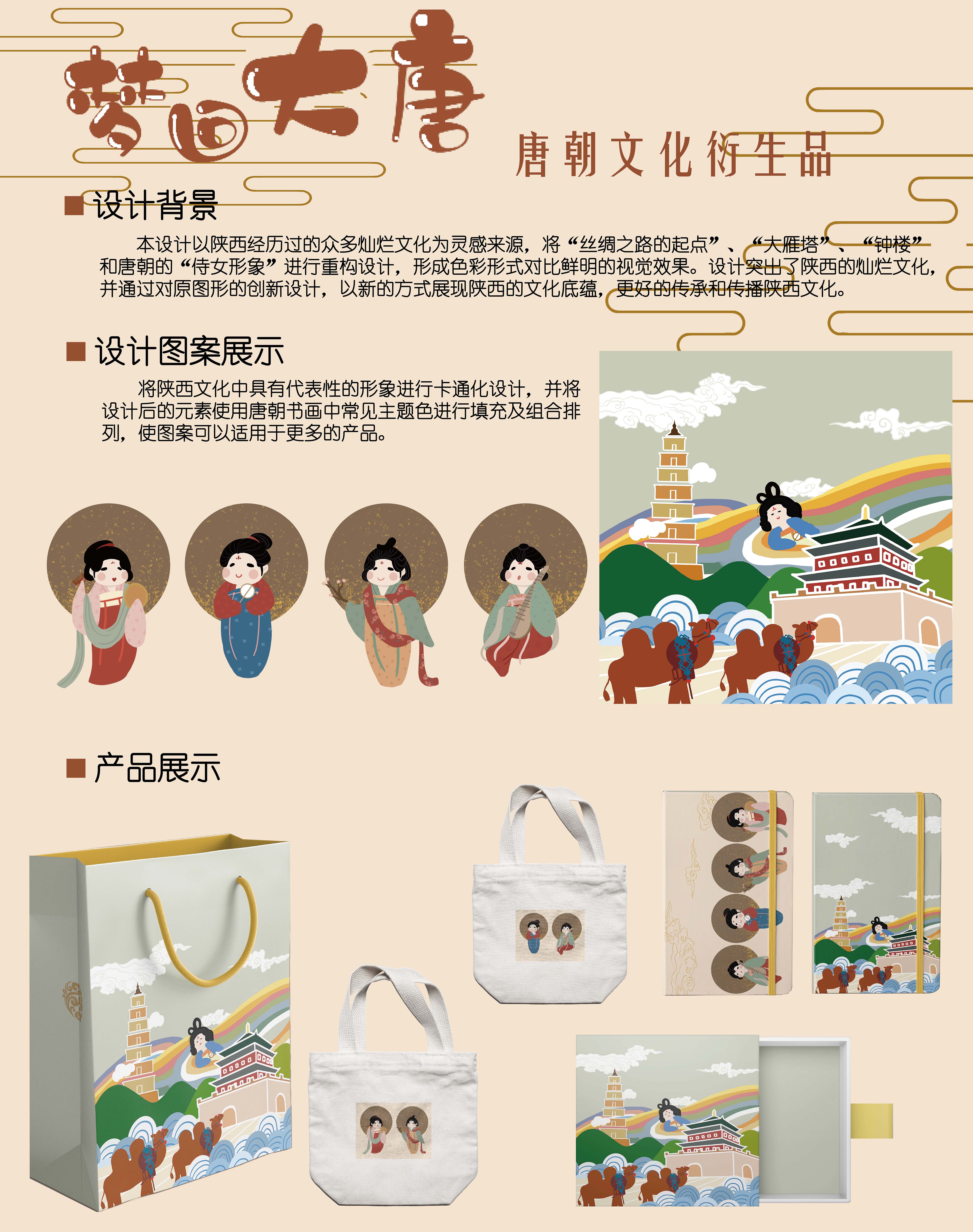 本设计以陕西经历过的众多灿烂文化为灵感来源,将“丝绸之路的起点”、“大雁塔”、”钟楼”大和唐朝的“待女形象”进行重构设计,形成色彩形式对比鲜明的视觉效果。设计突出了陕西的灿烂文化,并通过对原图形的创新设计,以新的方式展现陕西的文化底蕴,更好的传承和传播陕西文化。将陕西文化中具有代表性的形象进行卡通化设计,并将设计后的元素使用唐朝书画中常见主题色进行填充及组合排列,使图案可以适用于更多的产品。