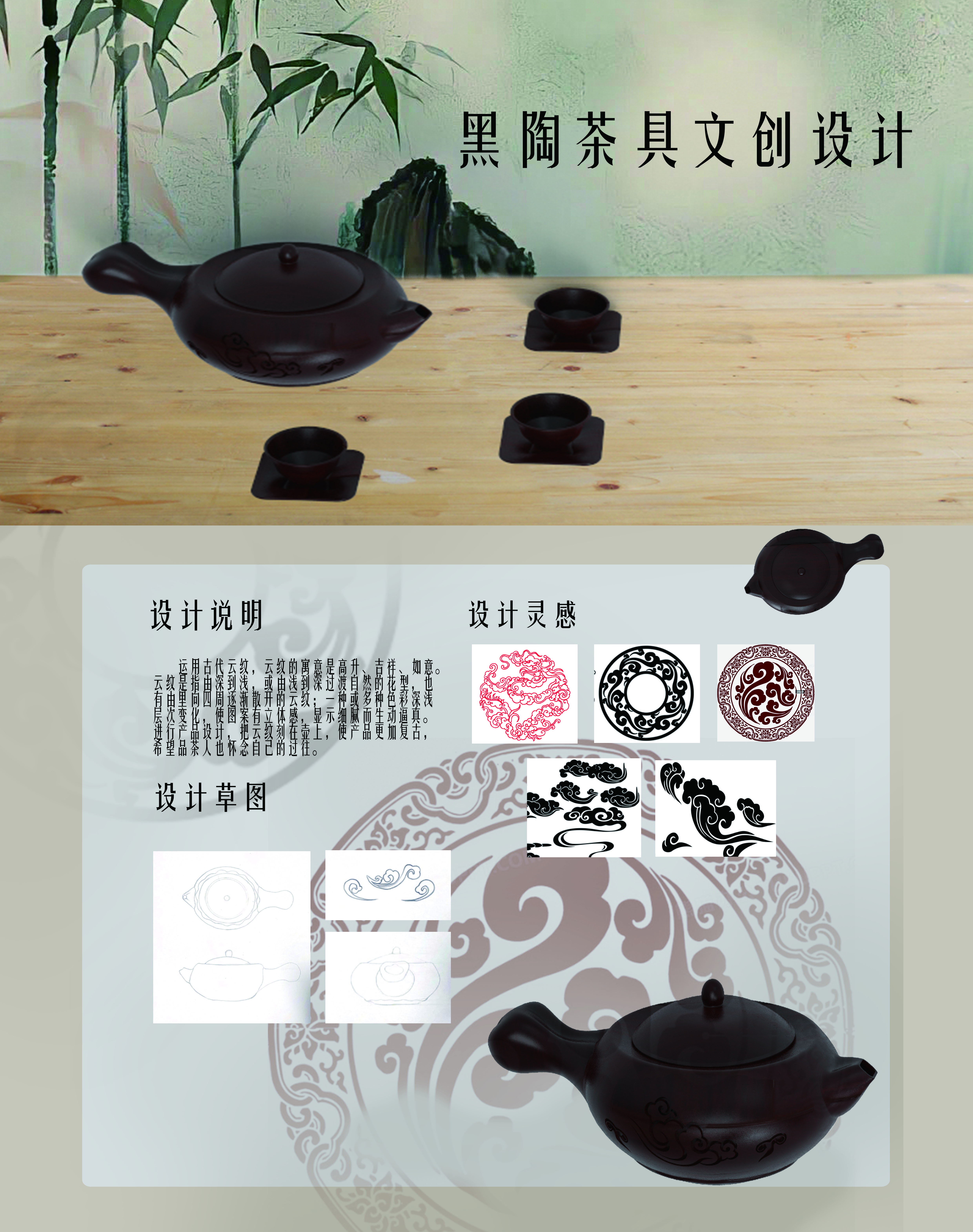 运用古代云纹,云纹的寓意是高升、吉祥、如意。 云纹是指由深到浅,或由浅到深过渡自然的花型,也 有由里向四周逐渐散开的云纹;一种或多种色彩深浅 层次变化,使图案有立体感,显示细腻而生动逼真。 进行产品设计,把云纹刻在壶上,使产品更加复古, 希望品茶人也怀念自己的过往。