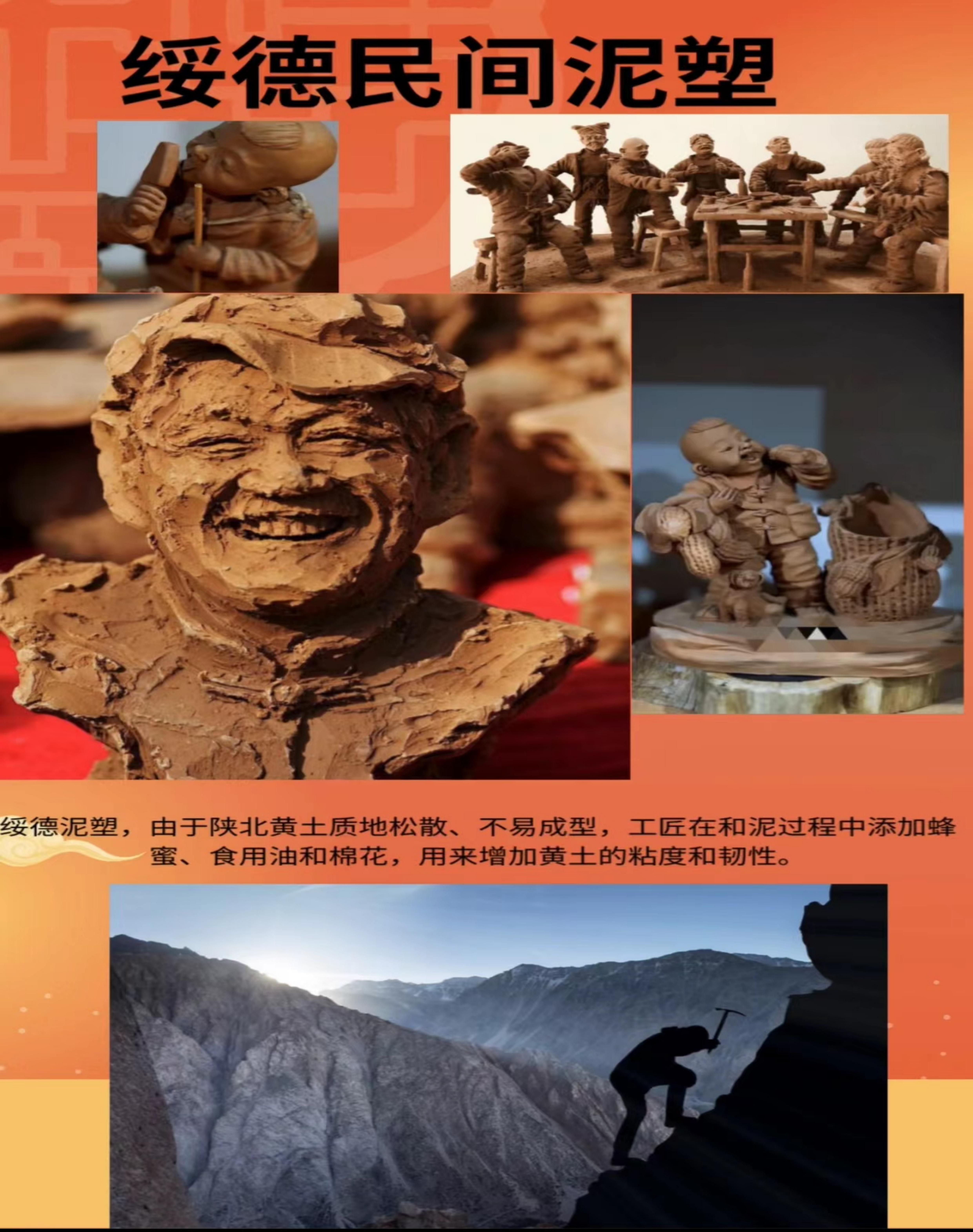 本作品是陕北传统文化或劳动场景,体现了陕北群众勤劳、质朴的形象,具有鲜明的黄土文化特征。绥德泥塑是黄土地上生活的瞬间它有手捏、模制、胎塑等技法,一件生动的泥塑作品需要经过铁丝塑形,和泥、捏泥等多道程序,人物泥塑首先是要把人的头部塑造出来,头部包含的更多的是它的表情和内心的情感,民俗泥塑主要记录的是民间日常生活,它的每一个泥塑出来的动作、表情都是瞬息万变的。