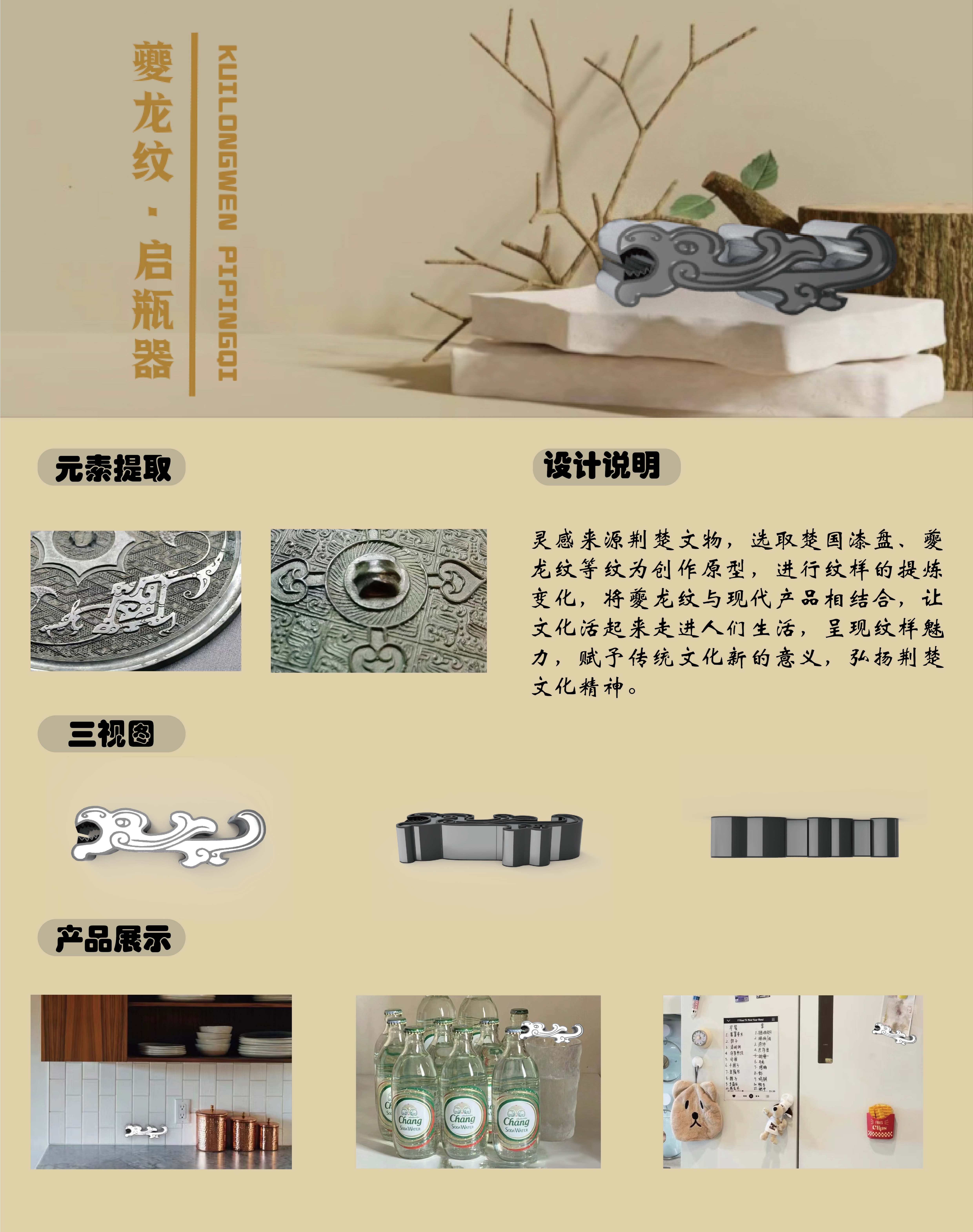 灵感来源荆楚文物,选取楚国漆盘、夔龙纹等纹为创作原型,进行纹样的提炼变化,将夔龙纹与现代产品相结合,让文化活起来走进人们生活,呈现纹样魅力,赋予传统文化新的意义,弘扬荆楚文化精神。