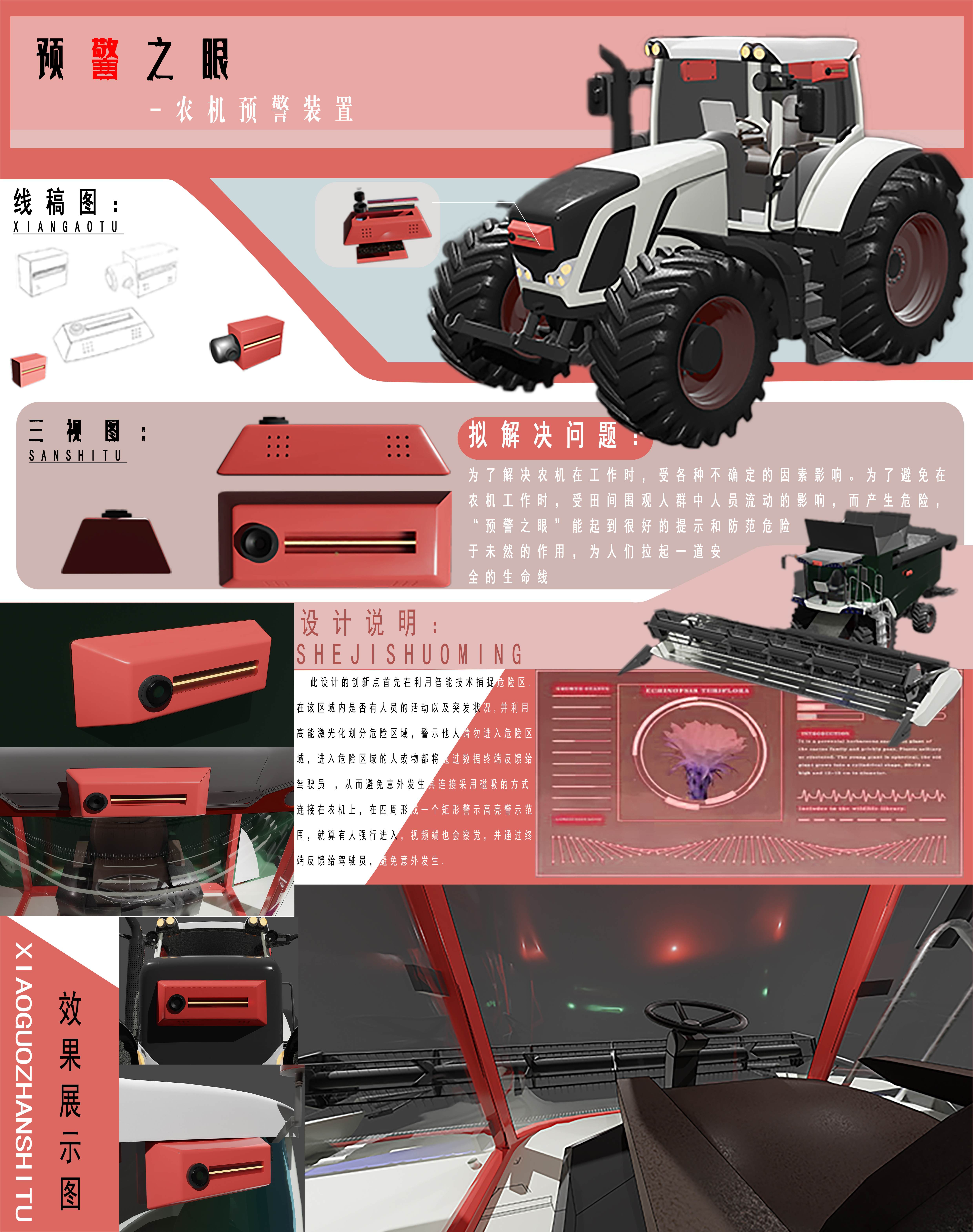 此设计的创新点首先在利用智能技术捕捉危险区,在该区域内是否有人员的活动以及突发状况,并利用高能激光化划分危险区域,警示他人请勿进入危险区域,进入危险区域的人或物都将通过数据终端反馈给驾驶员 ,从而避免意外发生。 其连接采用磁吸的方式连接在农机上,在四周形成一个矩形警示高亮警示范围,就算有人强行进入,视频端也会察觉,并通过终端反馈给驾驶员,避免意外发生。